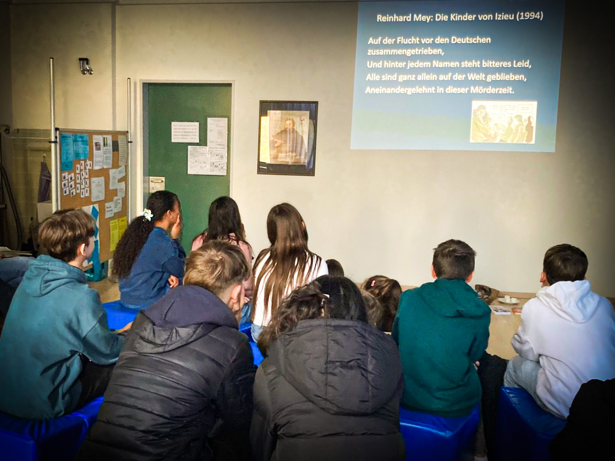 „Sie war`n voller Neugier, sie waren voller Leben…“ – das singt Reinhard Mey über die Kinder von Izieu. Die Erinnerung an die 44 Kinder, die im April 1944 aus dem Kinderheim von Izieu deportiert wurden, stand im Mittelpunkt der diesjährigen Gedenkveranstaltung zum 27. Januar im Raum der Stille, die von Schülerinnen der Klassen 7, 9 und 10 mitgestaltet wurde und von ca. 270 Schülerinnen und Schülern besucht wurde.